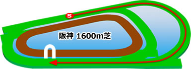 阪神芝1,600mは外回りコースながらコーナーを2回通過するため、道中の立ち回りが結果に影響しやすい条件です。