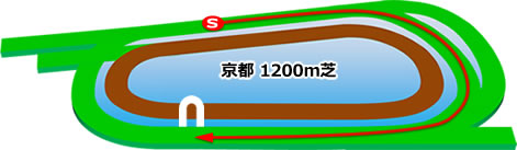 京都芝1,200mは向正面の直線半ばからスタートし、最初のコーナーまで約320mありますが、序盤は上り坂が続くため極端なハイペースになりにくい特徴があります。
