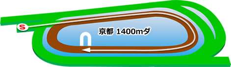 京都ダート1,400mは、芝スタートから平坦な直線へとつながるスピード型のダートコースです。